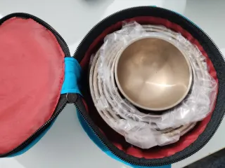 Conjunto de cuencos tibetanos de metal, presentados en un estuche protector. - Cuencos apilables. - Estuche con interior rojo y azul. - Cierre de cremallera.