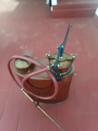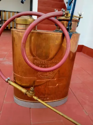 Mochila sulfatadora antigua de cobre, también conocida como pulverizador. - Fabricada en cobre. - Incluye manguera y lanza. - Grabado PULVERIZADOR EXTRA y MARCA REGISTRADA. Del año aproximadamente 1950 Este es un pulverizador o sulfatador antiguo de cobre, con la marca "Extra" registrada. Se utilizaba tradicionalmente para la aplicación manual de tratamientos en cultivos y huertos. Pieza de colección elaborada en cobre y componentes de latón. La marca visible es "Extra", con la inscripción "Marca Registada". La inscripción "Qualidade Mor" es visible en parte inferior. Artículo para "decoración" sin golpes " ORIGINAL"