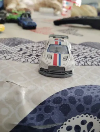 Coche de juguete con un diseño deportivo y detalles de carreras. - Color plateado con franjas rojas y azules. - Alas traseras. - Ventanas tintadas.