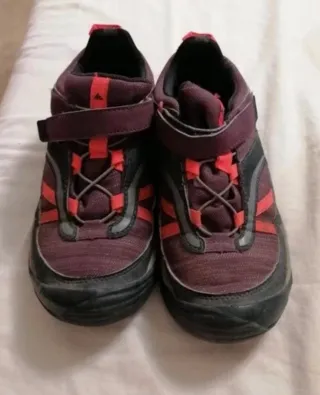 Zapatillas de montaña Quechua con tecnología waterproof. - Color burdeos y detalles en naranja. - Cierre de velcro y cordones. - Suela de goma. -Talla 34 -En buenas condiciones