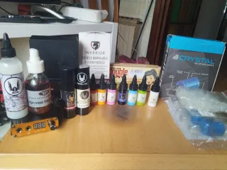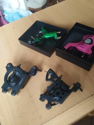 Kit de tatuaje para empezar tu camino en el arte corporal. Incluye todo lo necesario para tus primeras creaciones. -4 Máquina de tatuaje. 2 rotativas 2 de bobina - Fuente de alimentación. - Tintas de tatuaje de varios colores.marca viking. - Agujas estériles desechables. - Líquido de transferencia. - Accesorios varios. - pedal fuente alimentación - pieles sintéticas unas 50 - papel Transfer. Las agujas y tinta están nuevas usadas muy poco pero caducaron por lo que solo se puede usar para practicar en las pieles sintéticas, lo mismo las agujas.