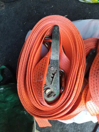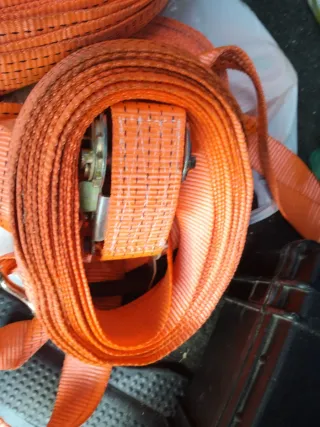 Juego de cinchas de sujeción de color naranja con trinquete metálico.de mas 10m - Cinchas de poliéster resistentes. - Trinquete de metal para ajuste seguro. - Ganchos de metal para anclaje.
