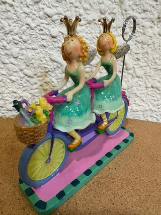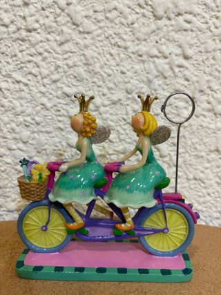 Este encantador soporte decorativo es perfecto para exhibir tus fotos o notas especiales. Presenta dos adorables hadas con coronas y alas, montadas en una bicicleta tándem. - Diseño detallado con hadas y bicicleta. - Base decorativa en tonos vibrantes.