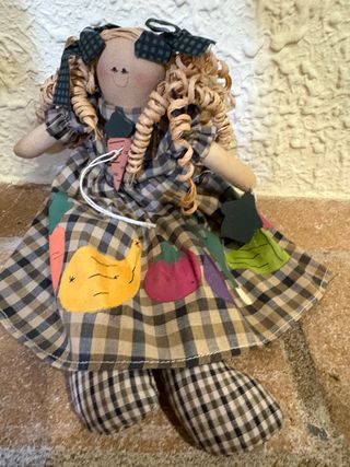 Adorable muñeca de trapo con un diseño encantador. - Vestido a cuadros con aplicaciones de verduras. - Pelo rizado y lazos. - Piernas a cuadros.