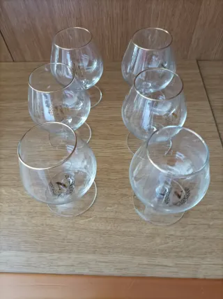 Set de seis copas de coñac o brandy, ideales para disfrutar de tus bebidas favoritas. Están a estrenar. - Diseño elegante con borde dorado. - Perfectas para coleccionistas o para regalar.