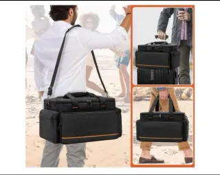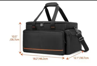 Práctica bolsa de viaje negra con múltiples compartimentos para organizar tus pertenencias. - Medidas: 46.2 cm (largo) x 30.7 cm (ancho) x 26.7 cm (alto). - Diseño moderno con detalles naranjas. - Asa superior y correa ajustable para hombro.