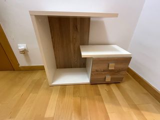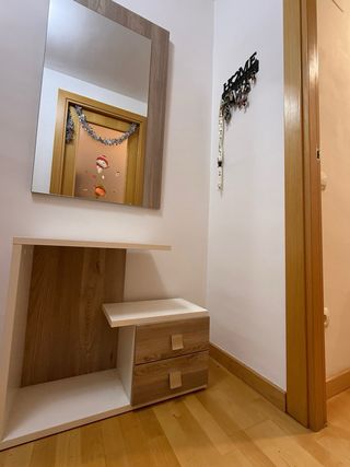 Mueble recibidor de diseño moderno con acabado en madera y blanco. - Diseño asimétrico. - Dos cajones con tiradores metálicos. - Compartimento abierto. Más espejo