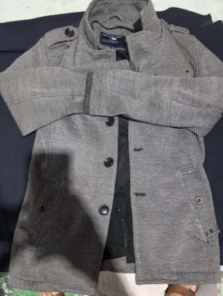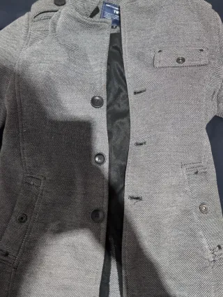 Chaqueta de tela gris con un diseño moderno y elegante. - Cierre de botones. - Cuello alto. - Bolsillos laterales.