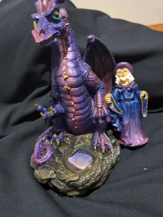 Figura decorativa de un dragón morado con un mago. - Detalles en tonos morados y dorados. - Base rocosa con gema. - Diseño fantasioso.