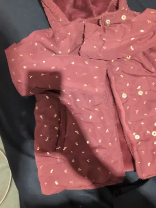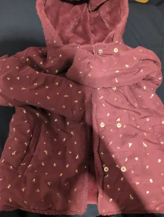 Chaqueta para niña con un bonito estampado. - Color granate. - Forro interior de pelo. - Estampado de pequeños detalles dorados. - Capucha.