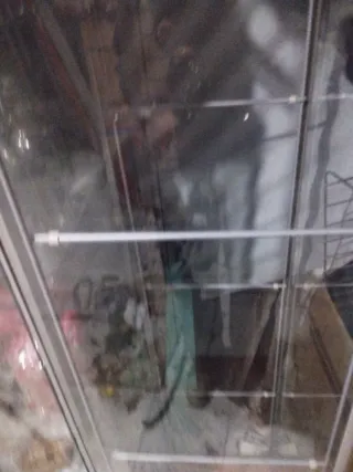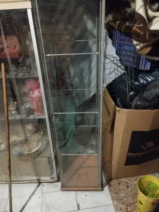 Vitrina de exposición con estructura de cristal y metal. -falta estantes de cristal Estantes de cristal. - Base de madera.