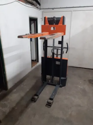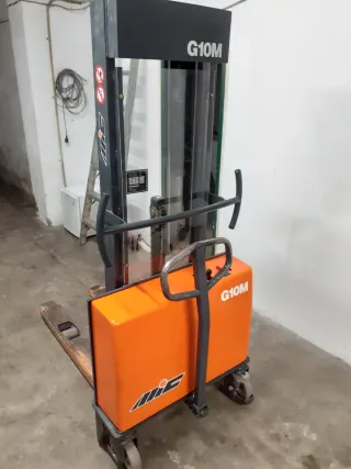Transpaleta eléctrica marca G10M, ideal para mover cargas pesadas en almacenes o talleres. - Modelo G10M. - Color naranja y gris. - Ruedas para desplazamiento. -Transpalet en buen estado con 2 baterías en perfecto estado -Funciona Perfecto con ruedas en buen estado -Mejor ver -Algo Negociable