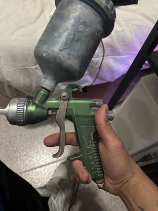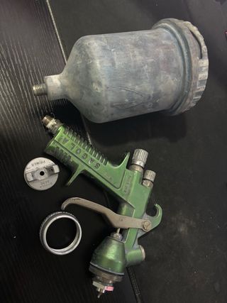Pistola de pintar Sagola, modelo 3030, con depósito y accesorios. - Pistola de pintar Sagola 3030. - Depósito de pintura. - Boquilla para primer (3030). - Anillo de sujeción. el deposito de pintura esta roto solo la tapa por el el tiempo y su desgastee lo demas esta en condiciones aceptables