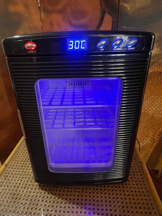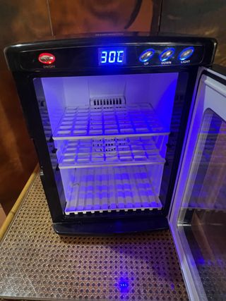 Incubadora casera creada a partir de una vinoteca. - Estructura principal de vinoteca. - Puerta de cristal. - Estantes interiores de alambre. Termostato que controla la calor y el frio Mide 70altox45anchox55 de fondo