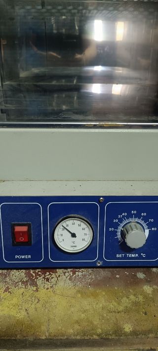 Estufa de laboratorio en buen estado. Temperatura máxima 60°C. Ideal para incubación de muestras. - Capacidad para varios recipientes. - Incluye termómetro digital. - Estructura de acero inoxidable.