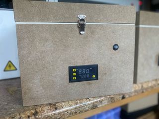 Incubadora para reptiles, con dos zonas de temperatura, para diferentes puestas, gran capacidad, luz interior led y dos programadores inkbird, testada y sacando puestas sin problemas, con una marca del trasporte anterior, que no afecta al funcionamiento. - Control de temperatura regulabre.