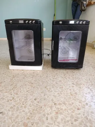 Incubadora automática para huevos, ideal para criar polluelos. - Pantalla digital para control de temperatura. - Diseño blanco y azul. - Hay dos unidades. - 150€ cada una.