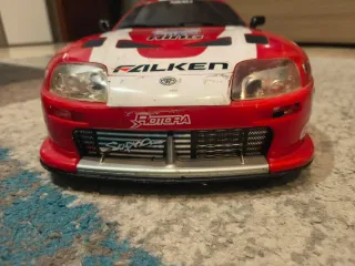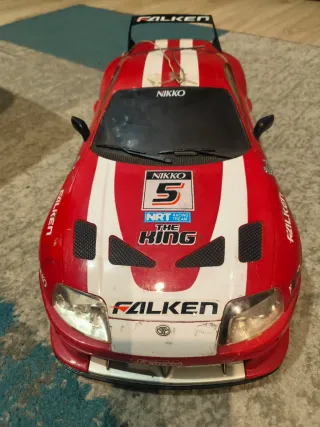 Coche radiocontrol a escala del Toyota Supra, marca Nikko. Presenta un diseño deportivo en color rojo con detalles blancos y el logo de Falken. - Réplica del Toyota Supra. - Marca Nikko. - Diseño de carreras con Falken. Funciona pero no tiene mando ni baterías. Con los defectos estéticos de las fotos. Escala 1/10 aprox