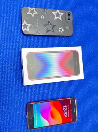 iPhone SE de segunda generación en color rojo. Incluye funda protectora con diseño de estrellas y su caja original. - Modelo: iPhone SE (2020) - Color: Rojo - Funda protectora con estrellas - Caja original