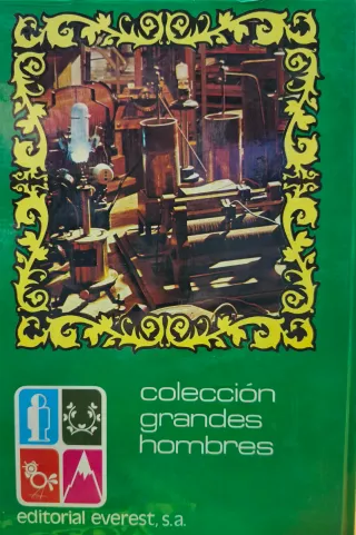 Libro sobre la vida y obra de Albert Einstein. - Portada verde con diseño. - Retrato de Albert Einstein enmarcado. - Título Albert Einstein en letras amarillas.