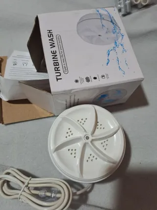 Lavadora portátil con diseño de turbina, ideal para viajes o espacios pequeños. Compacta y fácil de usar. - Diseño blanco. - Incluye cable de alimentación.