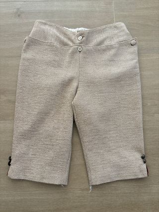Conjunto de traje de comunión en color beige satinado. Incluye chaqueta y pantalón. - Tejido satinado brillante. - Diseño elegante con detalles en blanco. - Chaqueta con mangas largas. - Pantalón con cintura elástica.