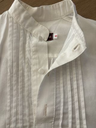 Camisa color crudo de estilo fallero, con cuello alto y detalles plisados en la pechera. - Cuello alto. - Botones frontales. - Mangas largas con puños abotonados. - Diseño plisado en la parte delantera. Talla 8