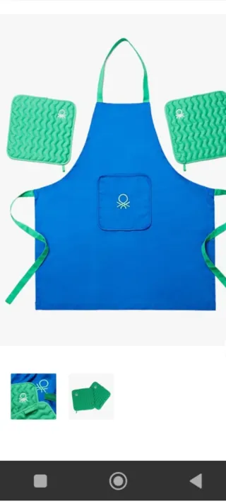 Conjunto de delantal Benetton en color azul, con un bolsillo frontal y ribetes en verde. - Incluye dos agarraderas cuadradas a juego en color verde. - El delantal tiene el logo de Benetton bordado en el bolsillo.