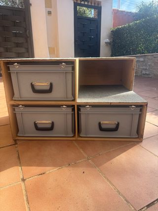 Mueble organizador de madera con cuatro cajones grises. - Estructura de madera. - Cuatro cajones de plástico gris de almacenaje - lateral para nevera - lo llevaba un toyota para hacer rutas