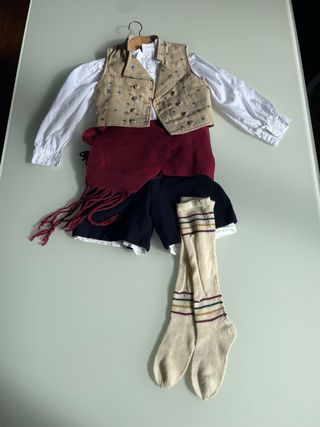 Conjunto de traje fallero para niño, talla 2-3 años. Incluye varias piezas para un atuendo completo. Incluye: - Chaleco con estampado. - Blanquilla. - Calzón azul marino. - Fajín. - Calcetines. - Camisa. - Espardenyas.