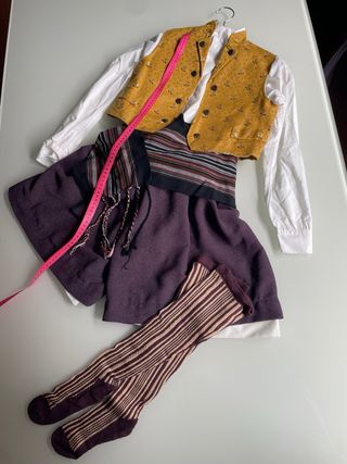 Conjunto de traje fallero para niño, (aproximadamente 10-12 años). - Chaleco amarillo con estampado floral. - Camisa blanca de manga larga. - Calzón morada. - Fajín. - Blanquilla