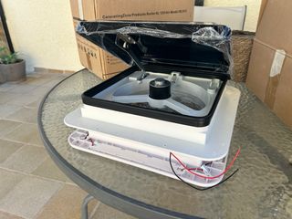Claraboya blanca para camper o autocaravana, con ventilador integrado y tapa transparente. - Color blanco. - Tapa transparente. - Ventilador incluido. - Cableado rojo y negro visible.