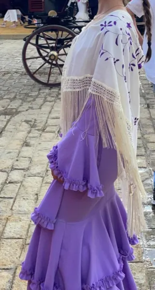 Traje de flamenca de color morado, con mangas acampanadas y volantes. - Incluye mantoncillo a juego. - Diseño con volantes en mangas y falda. - Escote en pico.