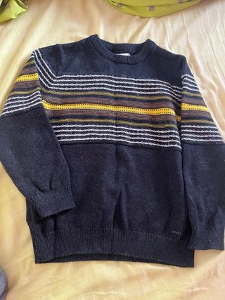 Jersey de punto para niño de la marca Mayoral. Talla 6 años. Presenta un diseño con rayas horizontales en la parte superior. - Diseño de rayas. - Cuello redondo. - Manga larga.