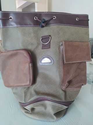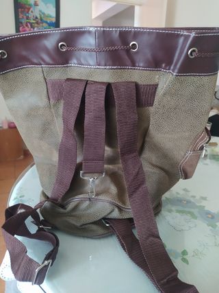 Mochila de la marca El Corte Inglés. - Piel sintética -Bolsillo con cuerda interior,bolsillos delanteros,correas ajustables,etc.. - Sin uso - Color verde y marrón. - Cierre de cordón y cremallera. - Bolsillos exteriores.