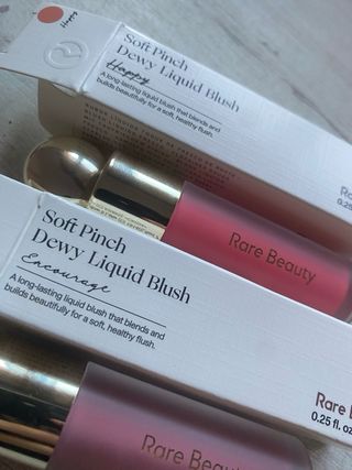 Lote de 4 cosas Aceite labial con color Soft Pinch de Rare Beauty en el tono Hope. Su fórmula innovadora se transforma en un aceite nutritivo y ligero, 2 coloretes de rare y 1 rimel - Tono: Hope - Contenido: 3.0 mL / 0.10 fl. oz.