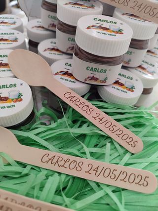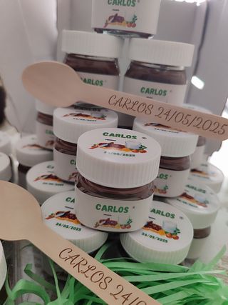 Tarritos de Nutella personalizados ¡Endulza tus eventos con un detalle irresistible! Ideales para bodas, bautizos, comuniones, cumpleaños o cualquier celebración especial. Personalizamos las etiquetas con nombres, fechas o diseños temáticos. Tamaño mini, pero con todo el sabor que encanta a todos. Sorprende a tus invitados con un detalle que nunca falla. Reserva con antelación. ¡Haz tu pedido ahora! Creaciones Alanís
