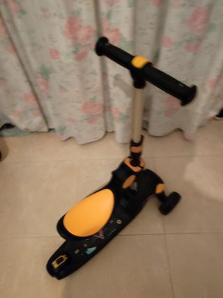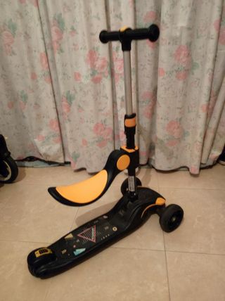 Patinete de tres ruedas para niños, con asiento desmontable. - Diseño en color negro y naranja. - Ruedas de goma. - Plataforma antideslizante.