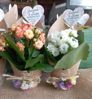 Detalle de boda con kalanchoe en maceta de 7cm. Incluye recordatorio, maceta y envoltorio.