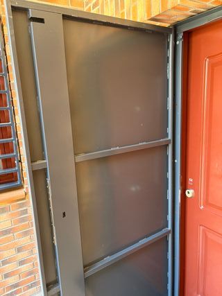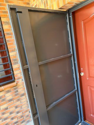 Puerta de seguridad antiokupa, ideal para reforzar la entrada de tu vivienda. Es robusta y de color gris oscuro. - Fabricada en metal resistente. - Diseño discreto y elegante. - Fácil instalación.