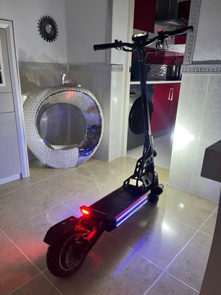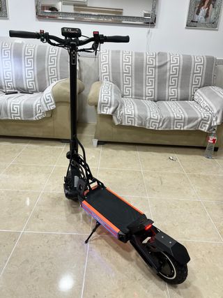 Patinete eléctrico con un diseño moderno y llamativo. Ideal para desplazamientos urbanos. - Luces LED decorativas en los laterales. - Luz trasera roja de freno. - Estructura robusta de color negro y naranja. Motor de 1000w-48v-20,8A. Maxima potencia 45km/h Vendo por no usarlo.