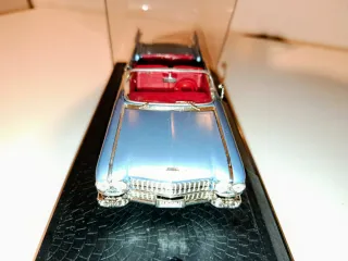 Réplica detallada del Cadillac Eldorado de 1959 de la marca Road Signature. Un clásico americano con un diseño icónico. - Color azul metalizado. - Interior en rojo vibrante. - Detalles cromados. - Base expositora incluida.