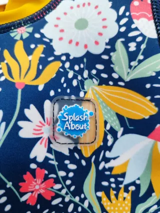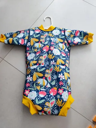 Prenda de neopreno para bebé con un alegre estampado floral y de insectos. Ideal para proteger del sol y el frío en la playa o piscina. - Diseño de manga larga. - Cuello redondo. - Puños y cintura en color amarillo. - Estampado multicolor sobre fondo azul marino.