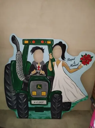 Original fotocall de madera hecho a mano, con diseño de tractor y espacio para caras. Ideal para bodas o eventos temáticos. - Diseño personalizado. - Fecha: 6-8-2022. - Incluye ramo de flores rojas.