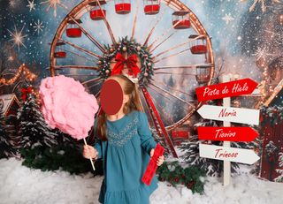 Fondo de fotografía con temática navideña y noria. Fondo utilizado en campaña de navidad, Pared, Utilizado solo en una campaña, se vende por renovación. Mide 300x200 ,muy real, buena impresión, encantó el año pasado. Es de tela, puede algun agujerito pequeño (foto) de clavarlo para que no se caiga, pero no afecta al fondo ni a la foto.
