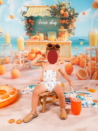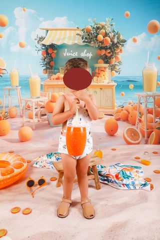Fondo de fotografía con temática de verano y playa, perfecto para crear, tiene unos colores muy vivos y bonitos. Es de tela puede tener algunos agujeritos de clavarlo en la apred, pero casi no se aprecian, ni afectan a las fotos. Mide 240x180 horizontal. Tengo también todos los accesorios. - Diseño con colores naranjas y azules. - Motivos de frutas y ambiente playero. - Ideal para sesiones fotográficas temáticas.