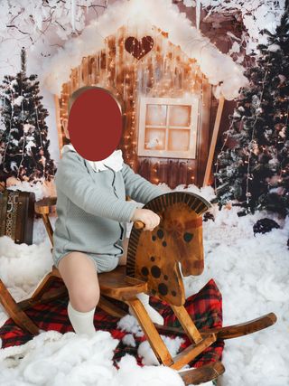 Fondo de fotografía con temática navideña, ideal para crear escenas invernales. - Diseño de casita de madera con luces. - Decoración con árboles nevados y detalles festivos. - Perfecto para sesiones de fotos temáticas.