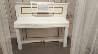 Piano blanco con un diseño clásico y elegante. Es de verdad, solo se utiliza de atrezzo porque no suena. Pintado en blanco y dorado, tiene algunos desperfectos del tiempo, pero no afecta a la fotografía. Al ser de madera, es bastante pesado, por lo que no se puede enviar, se vende por falta de espacio :( Recoger en Mayo. Medidas: Alto 1,22cm / Ancho 1,43cm / Profundidad 63cm