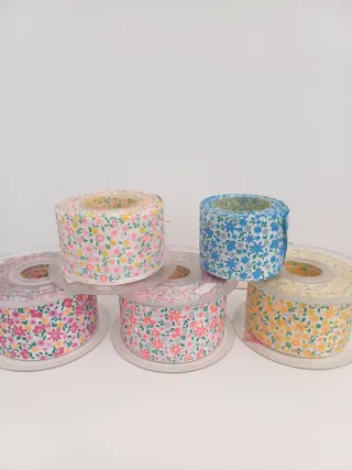 Súper saldo! Lote de cinco rollos empezados de cinta grosgrain de la misma colección, con un encantador estampado floral y distintos colores. Miden 4.8cm de ancho y entre todas las piezas hacen muchos metros.