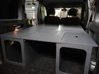 Mueble hecho a medida para furgoneta pequeña, ideal para Fiat Dobló, Opel Combo, Citroën Berlingo, Kangoo, Peugeot Partner... - Medidas: 120x180 - Colchón de espuma de alta densidad con una capa de viscoelástica, muy cómodo y con su funda, de 10 cm de grosor. - Estructura de madera gris. - Tres compartimentos de almacenaje. - Se encuentra en la zona de Aguilar de Campoo.